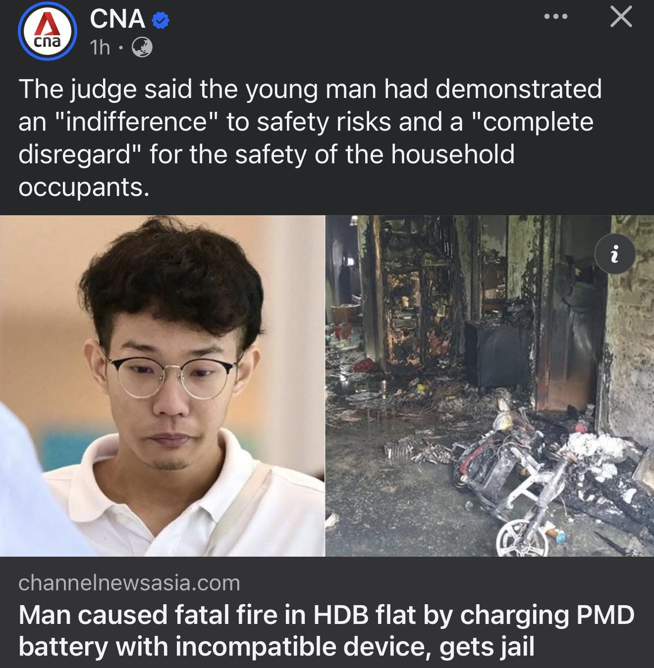 Fatal HDB fire caused by charging PMD battery with incompatible parts