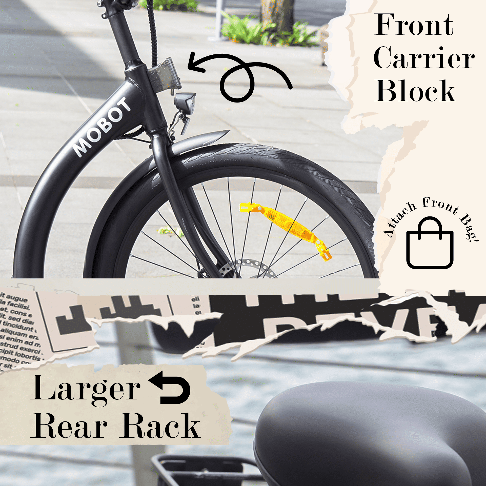 - Front Bag Mount and Rear Rack for more storage options