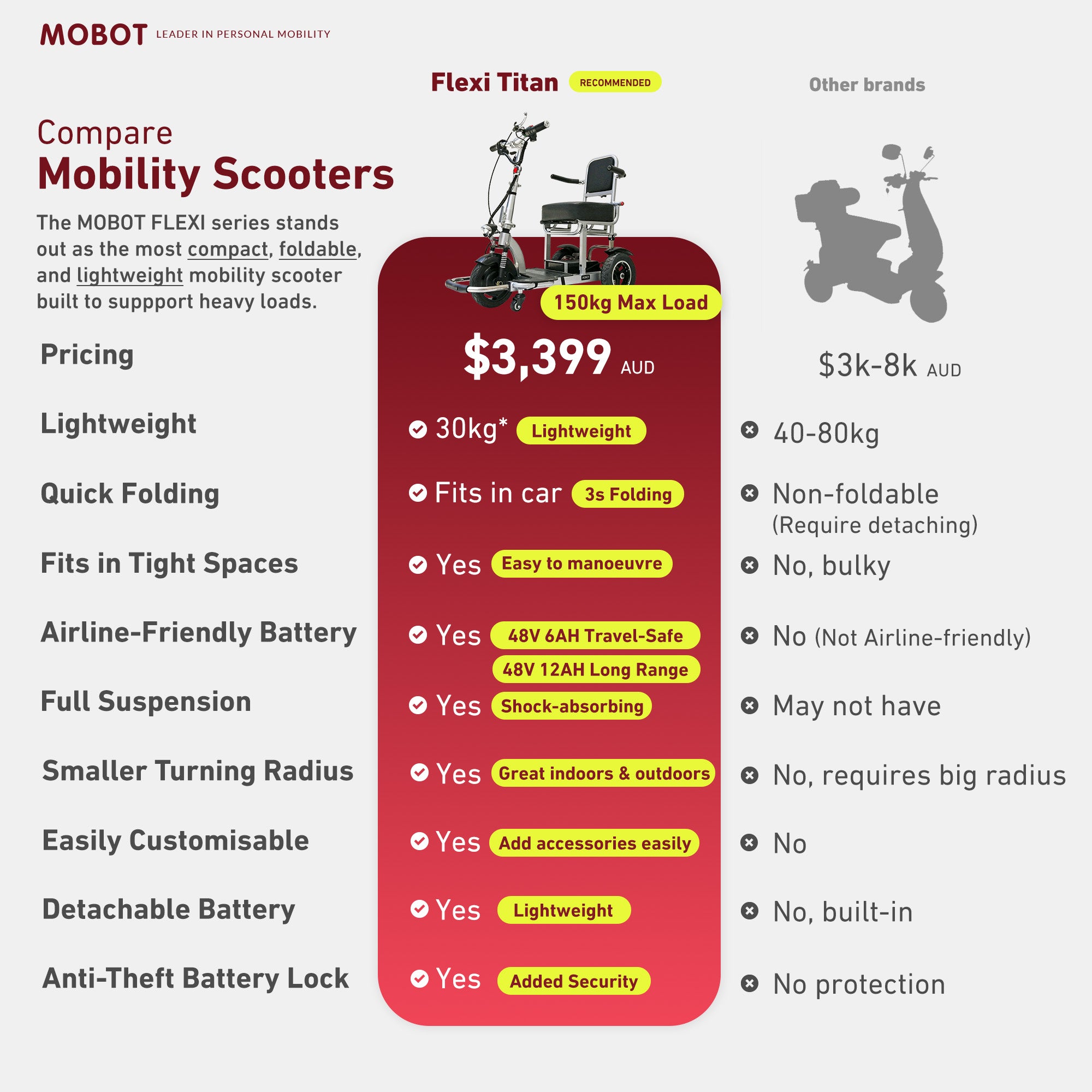Meet the MOBOT FLEXI Titan, the highlight 3-wheels folding mobility scooter in our best-selling FLEXI series with full front and rear suspension for an ultra-smooth ride. Built for durability, it’s compact and quick-folding, plus it features an airline-compliant battery—making the FLEXI Titan your ideal travel companion for any adventure!