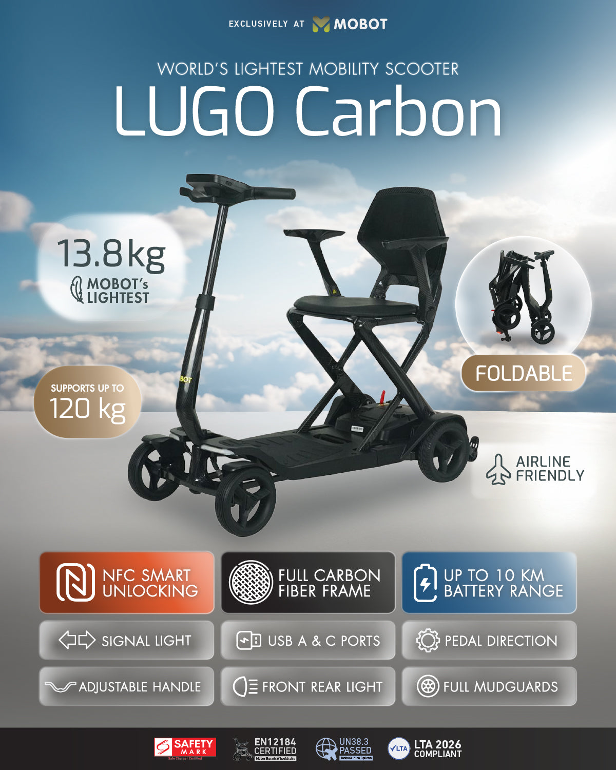 Meet the lightest carbon mobility scooter! The LUGO Carbon the perfect blend of premium design and effortless portability. Built with a full carbon fiber frame, it is ultra-light weighing just 13.8kg, incredibly strong, and stylish. It folds in seconds and can be carried like luggage, making travel a breeze. With NFC unlocking, a vibrant display panel, and an airline-friendly battery, the LUGO Carbon is your smartest, lightest companion wherever life takes you.