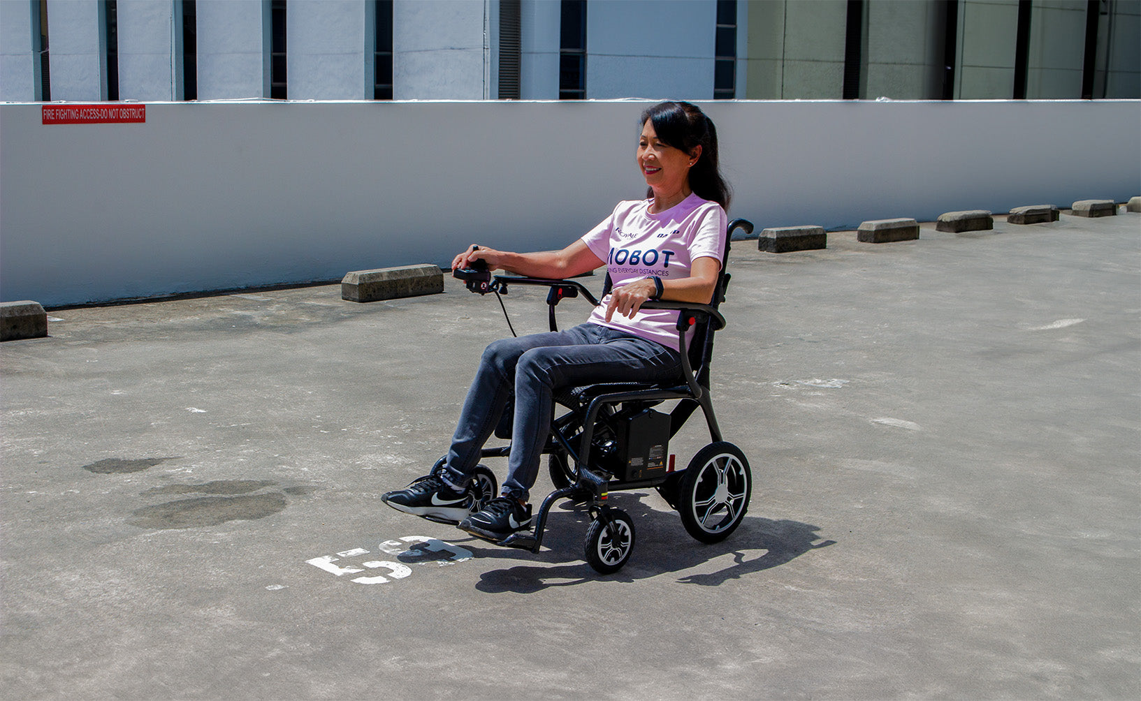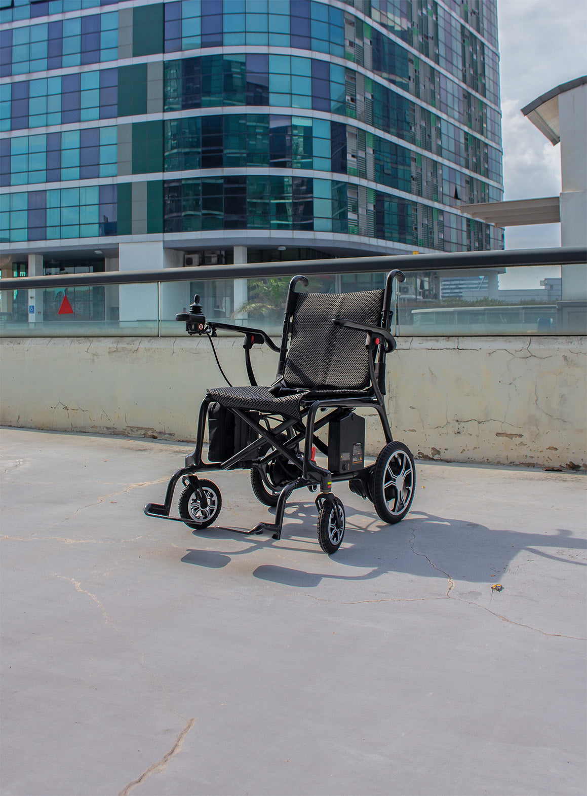 Constructed from high-quality carbon fibre with a unique pattern, it is reliable, rust-resistant and stylish, making it easy for caregivers to handle and users to control. Its sleek, compact foldable design makes it perfect for storage and travel.