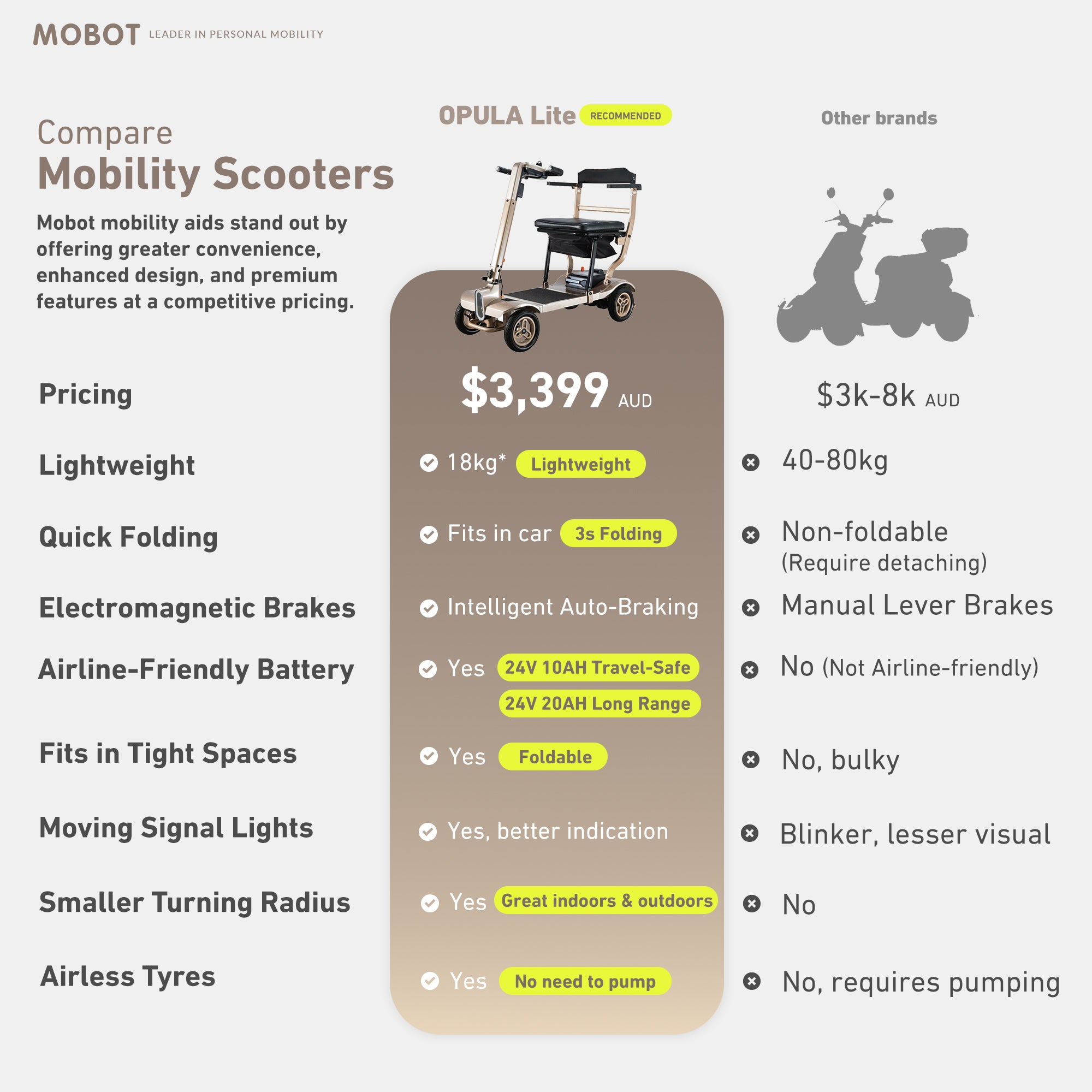 With most mobility scooters ranging from 20 to 80 kg, MOBOT’s OPULA Lite 4-wheel mobility scooter delivers an ultra-lightweight solution without compromising on quality or comfort.